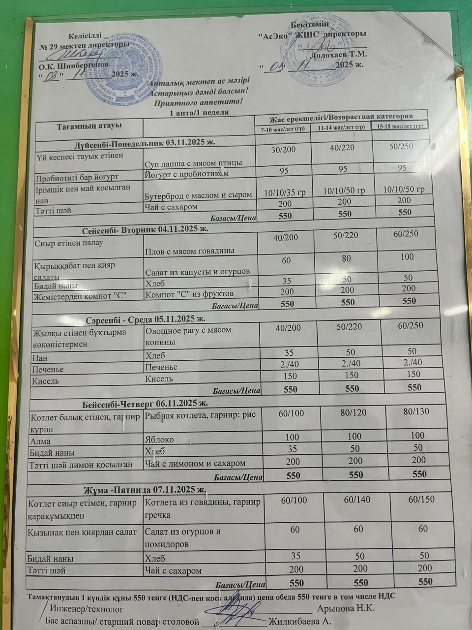 » 03.11-07.11.2025ж БІР АПТАЛЫҚ АС МӘЗІРІ.МЕНЮ