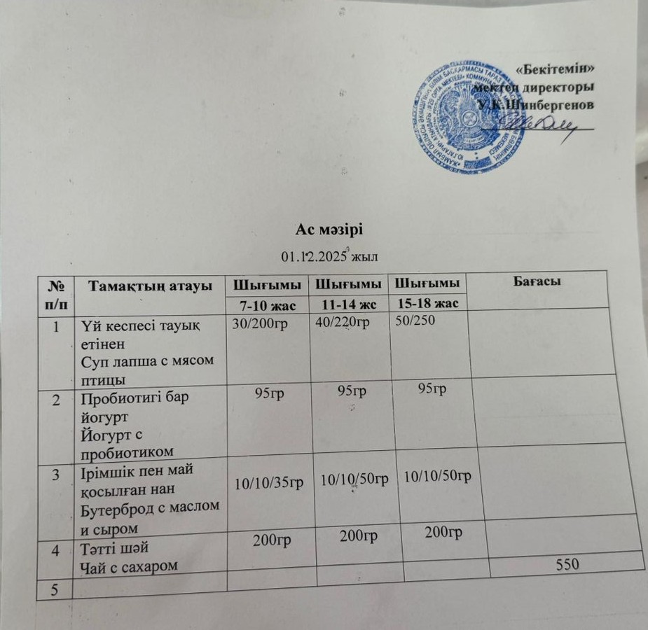 1.12.2025ж бір күндік ас мәзірі » СШ №29