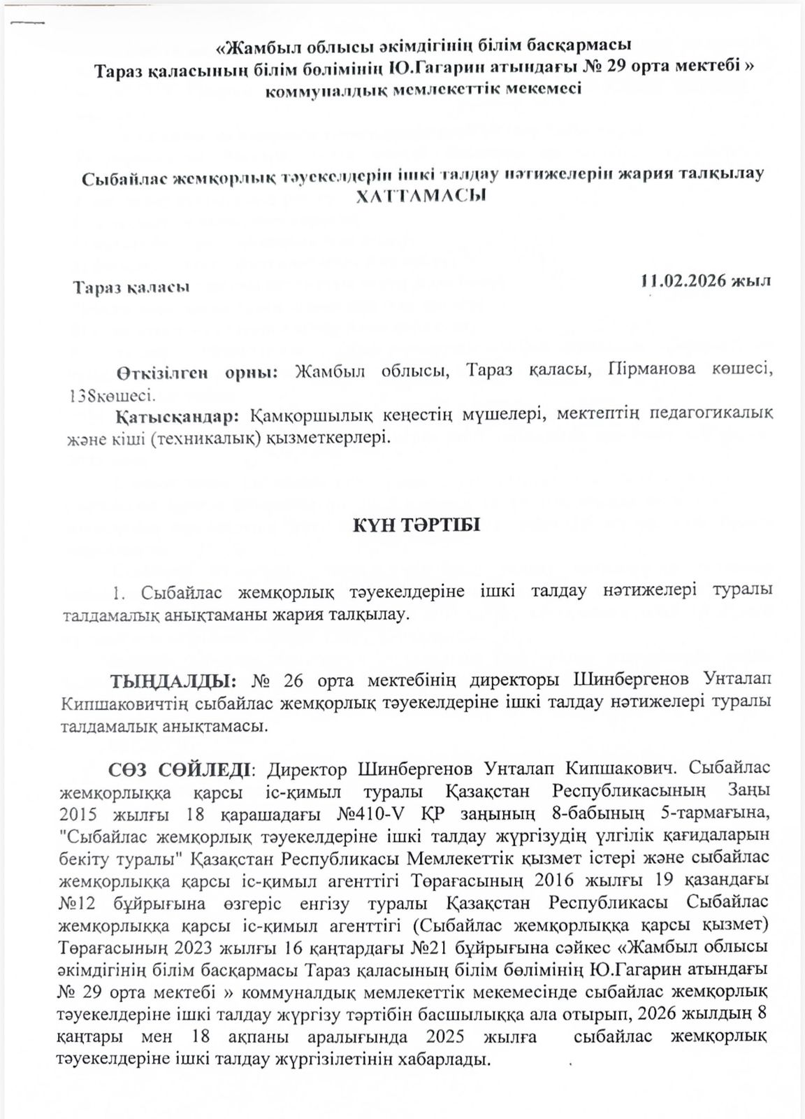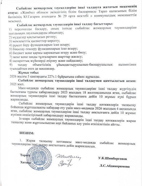 Сыбайлас жемқорлық тәуекелдерін ішкі талдау нәтижелерін жария талқылау ХАТТАМАСЫ » СШ №29