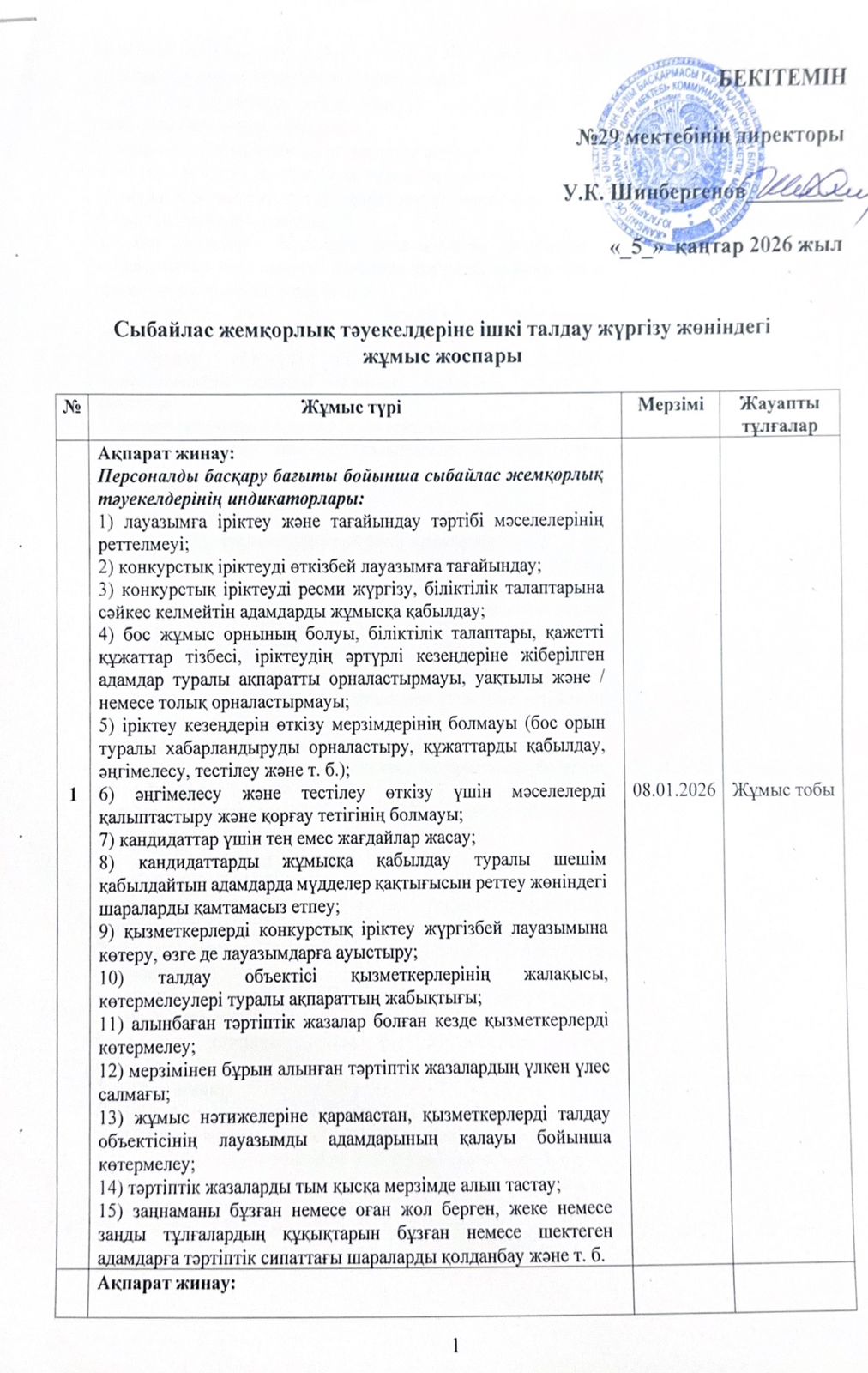 Сыбайлас жемқорлық тәуекелдеріне ішкі талдау жүргізу жөніндегі жұмыс жоспары » СШ №29