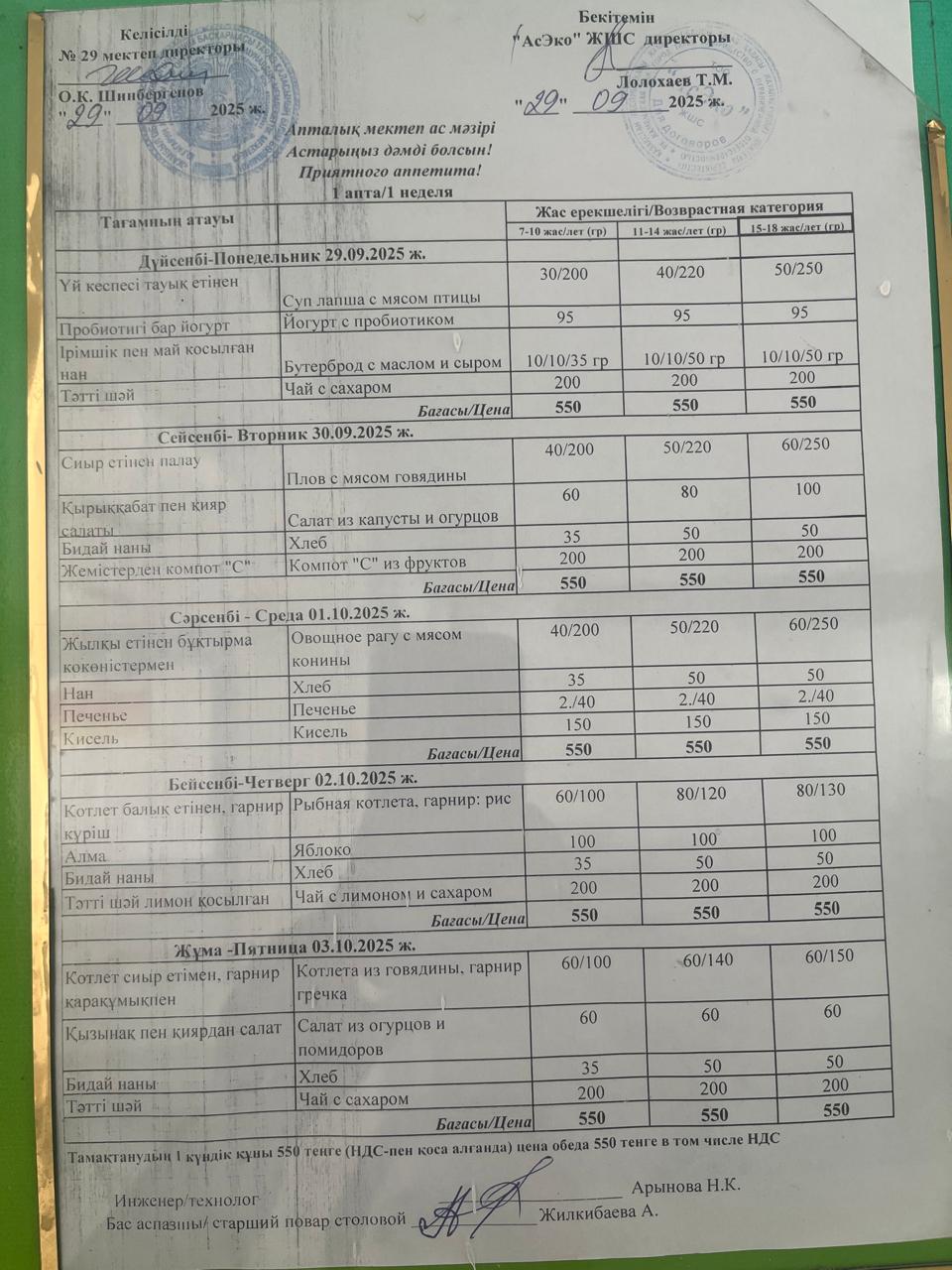 29.09-03.10.2025 ж БІР АПТАЛЫҚ АС МӘЗІРІ.МЕНЮ » СШ №29