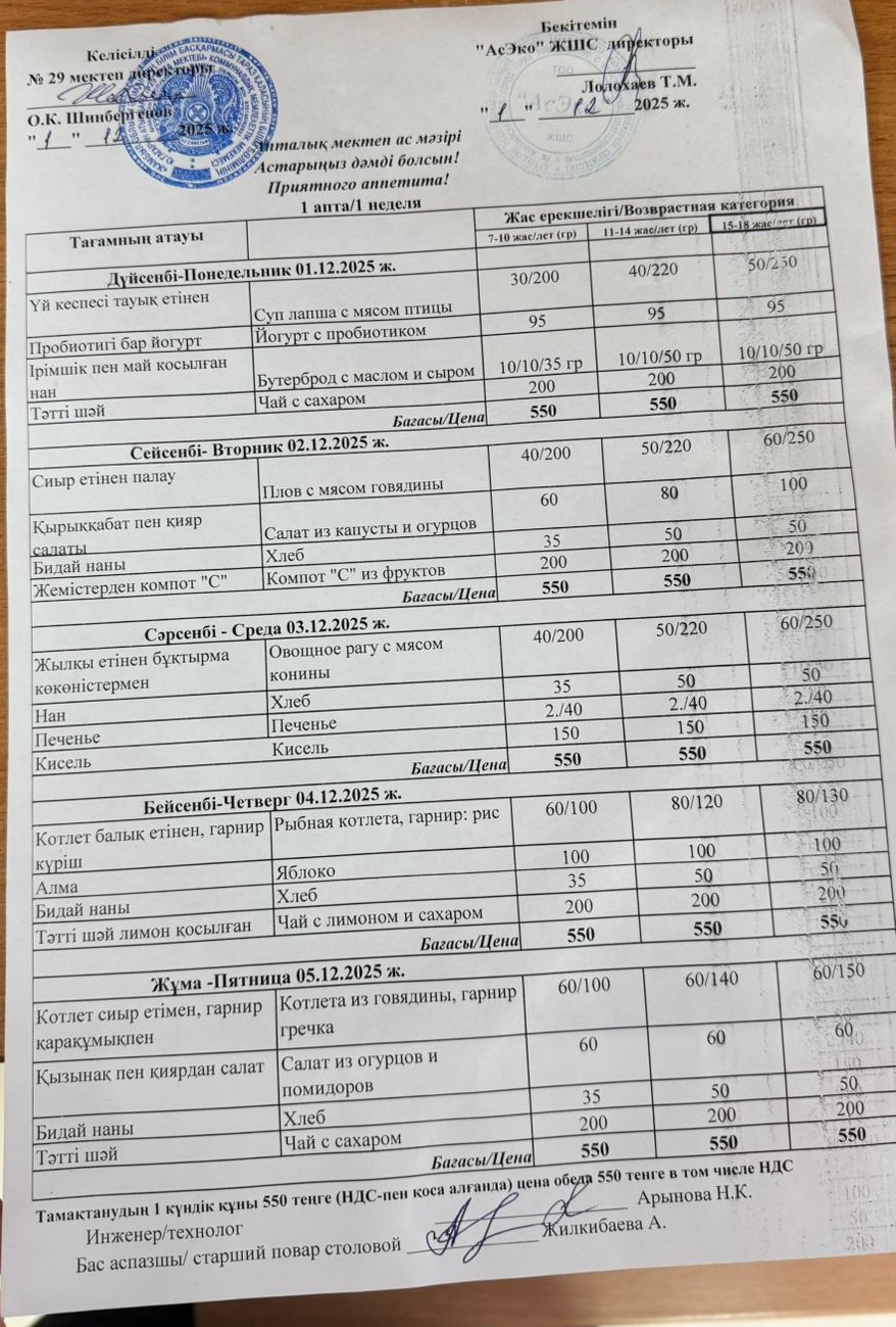 1.12.-5.12.2025ж. Мектеп асханасының бір апталық ас мәзірі » СШ №29
