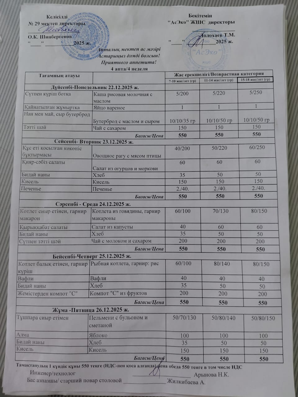 22-26.12 2025 Ж БІР АПТАЛЫҚ АС МӘЗІРІ / МЕНЮ » СШ №29