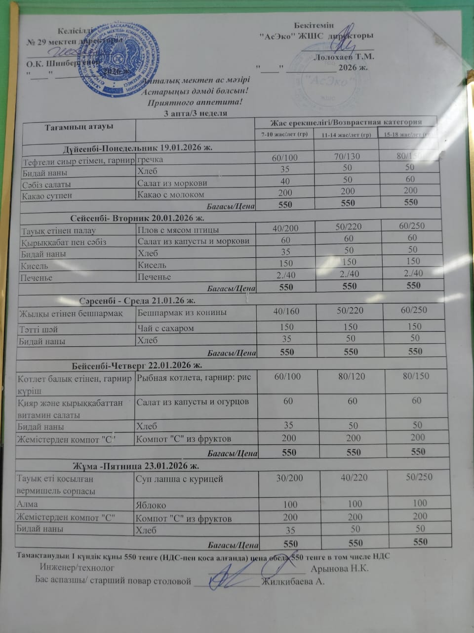 19-23.01.2026 Ж БІР АПТАЛЫҚ АС МӘЗІРІ / МЕНЮ » СШ №29