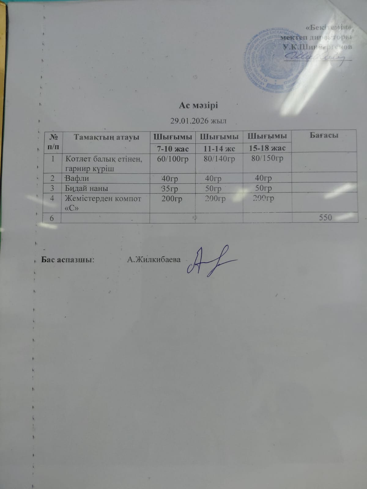 29.01.2026 ж БІР КҮНДІК АС МӘЗІРІ / МЕНЮ