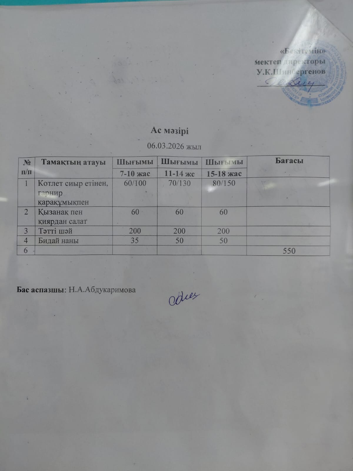 06.03.2026 ж БІР КҮНДІК АС МӘЗІРІ / МЕНЮ